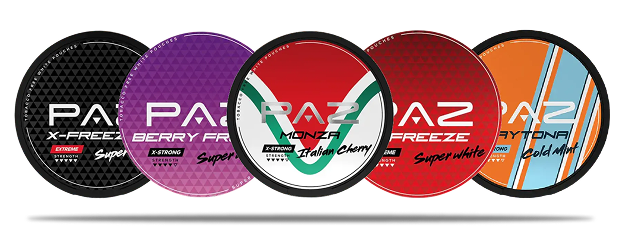 PAZ ponúka čisté, bezdymové vrecúška s dlhotrvajúcou chuťou. Každé vrecúško je naplnené silnými chuťovými profilmi s rôznou silou nikotínu. Rad je rozdelený na mätové a ovocné druhy pre svieži, jednoduchý výber. Každé vrecúško je predplnené chuťou, ktorá vydrží počas celej doby používania, pričom zachováva konzistentnosť chuti a účinku.